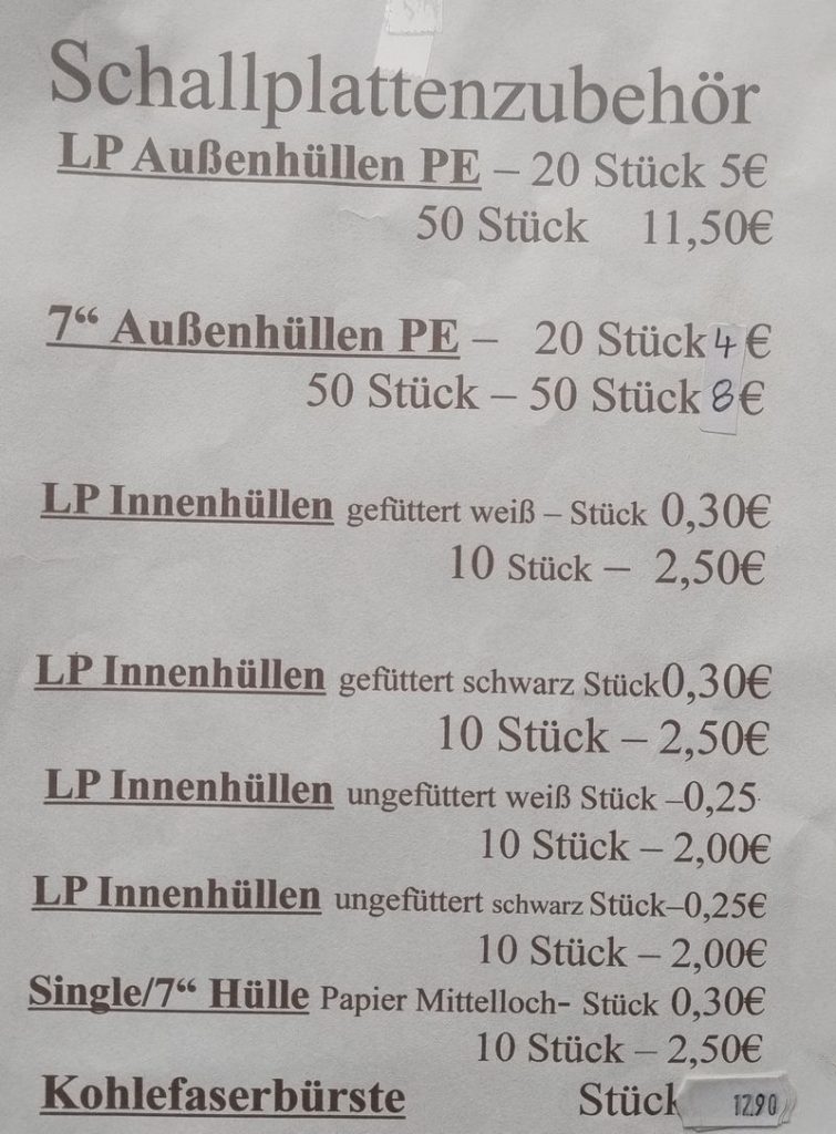 Moinsen – du benötigst neue Schallplatteninnen-, außenhüllen? Oder eine neue Kohlefaserbürste? Neue neutrale Vinylcover für deine coverlosen 7″ bzw. 12″ Schallplatten? Reinigungsflüssigkeit für dein verschmutztes Vinyl? Für unser Vinylzubehörsortiment siehe Foto’s. Unsere Öffnungszeiten siehe letztes Foto! SEE YA euer mr.afrobeat
